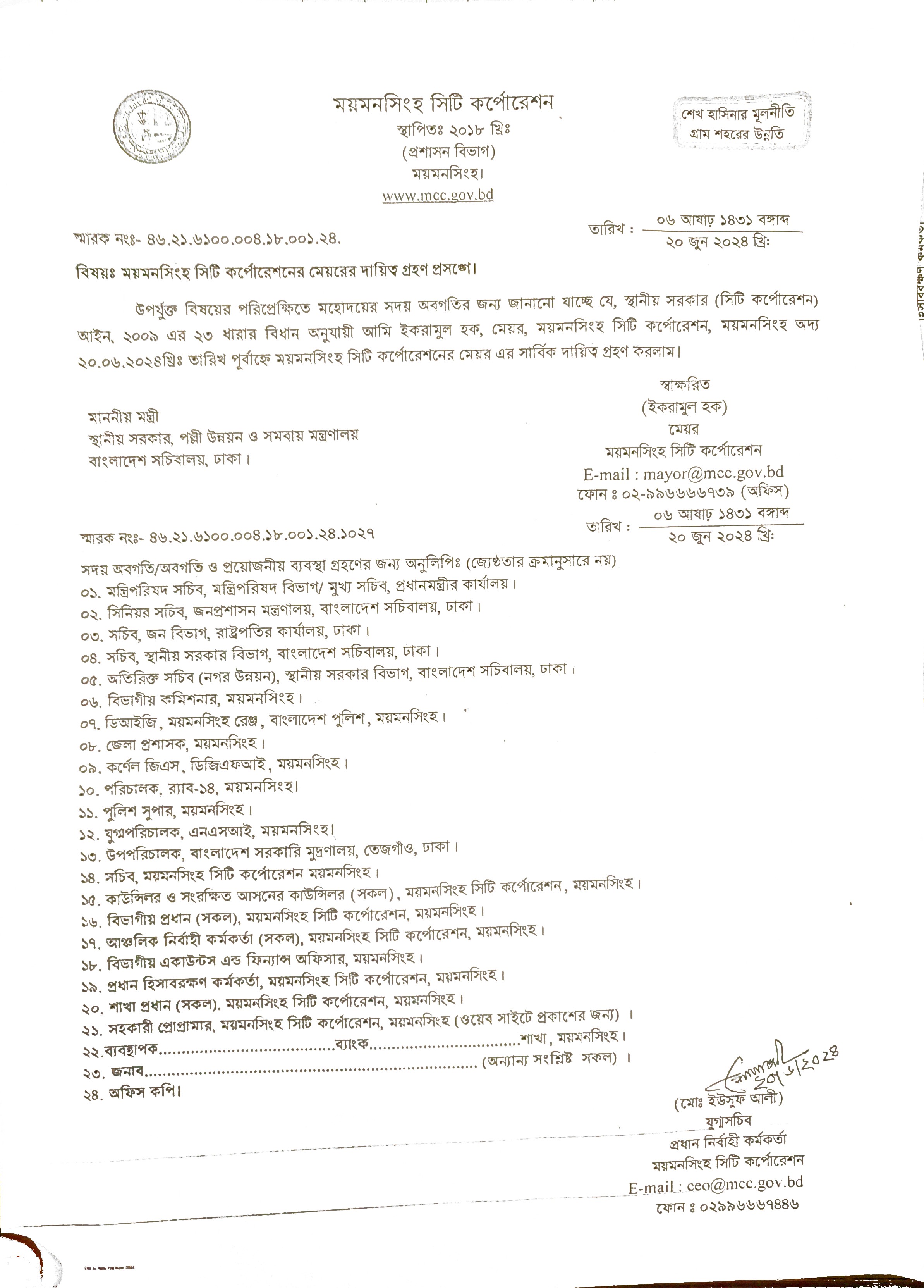 | ৭ | মাননীয় মেয়র মহোদয়ের দায়িত্ব গ্রহন সংক্রান্ত (২০/০৬/২০২৪) | ২০-০৬-২০২৪ | দেখুন | ||