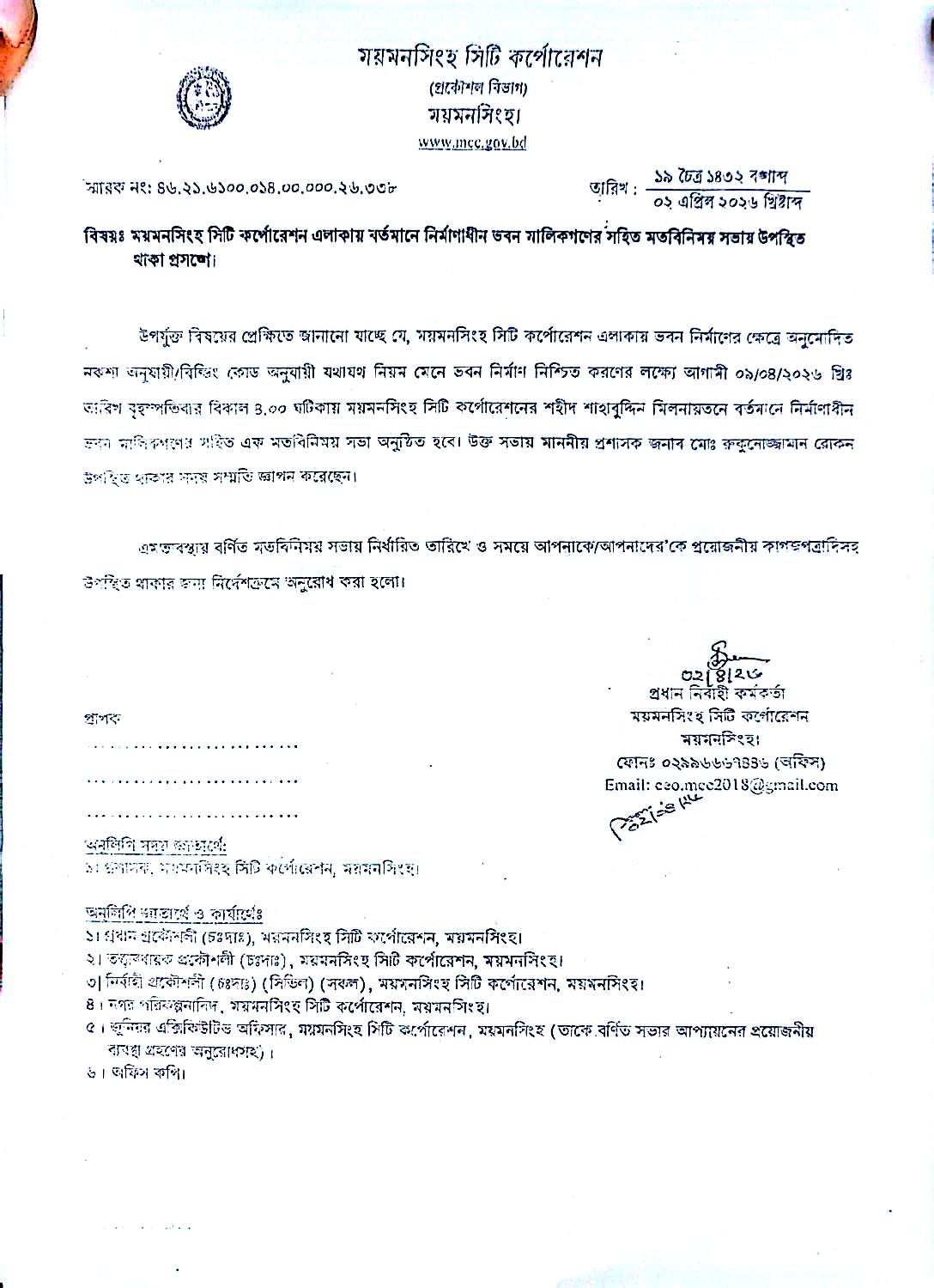 ময়মনসিংহ সিটি কর্পোরেশন এলাকায় বর্তমানে নির্মাণাধীন ভবন মালিকগণের সহিত মতবিনিময় সভায় উপস্থিত থাকা প্রসঙ্গে।