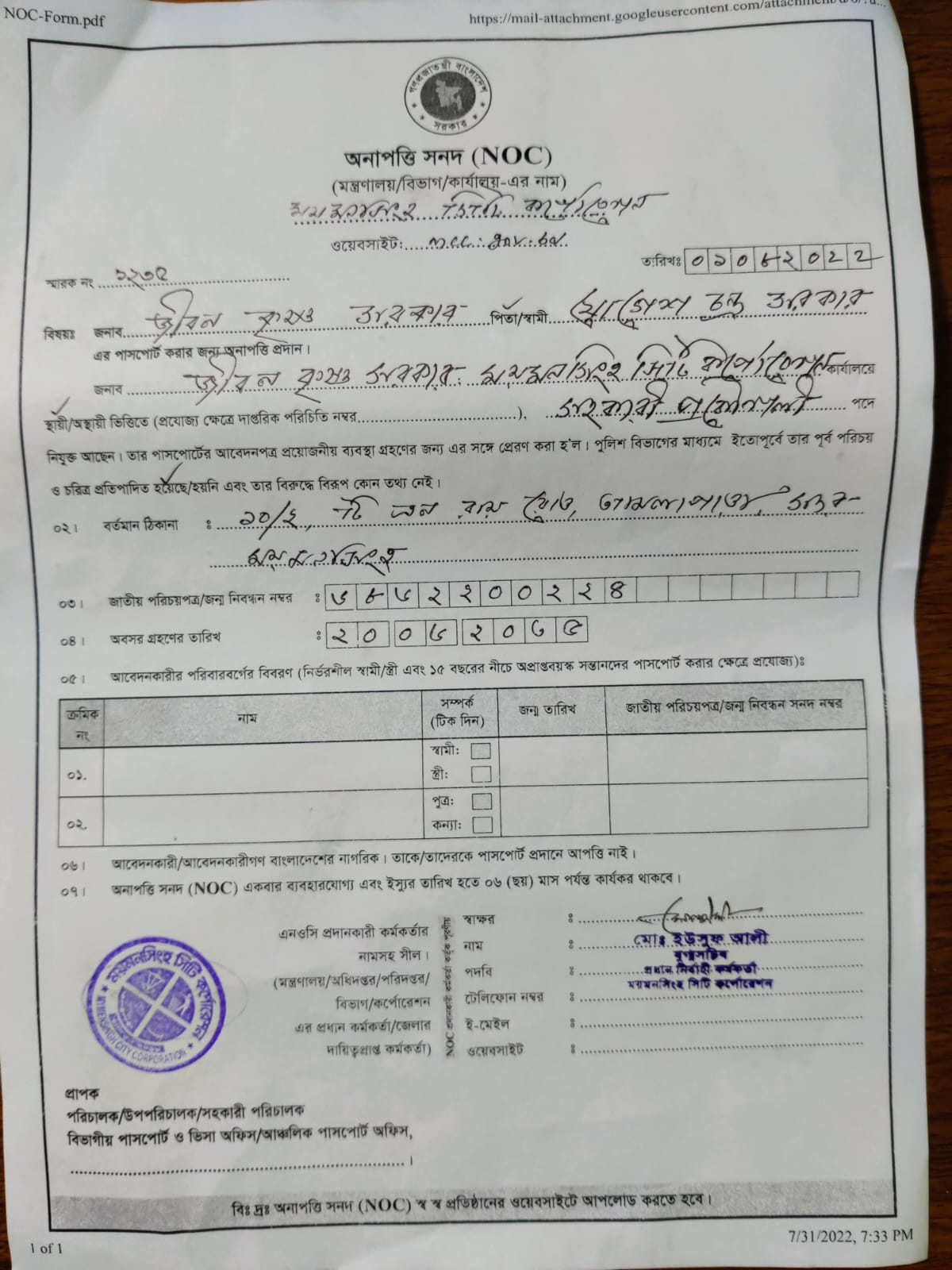 এনওসি জীবন কৃষ্ণ সরকার সহকারী প্রকৌশলী (সিভিল)